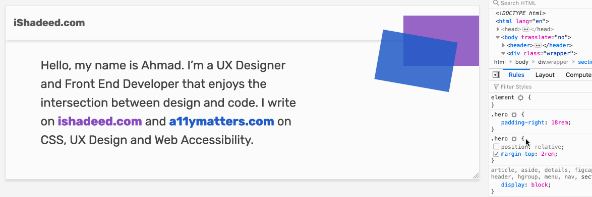 Notice in the below GIF how removing position: relative from the .hero section affects the pseudo-elements.
