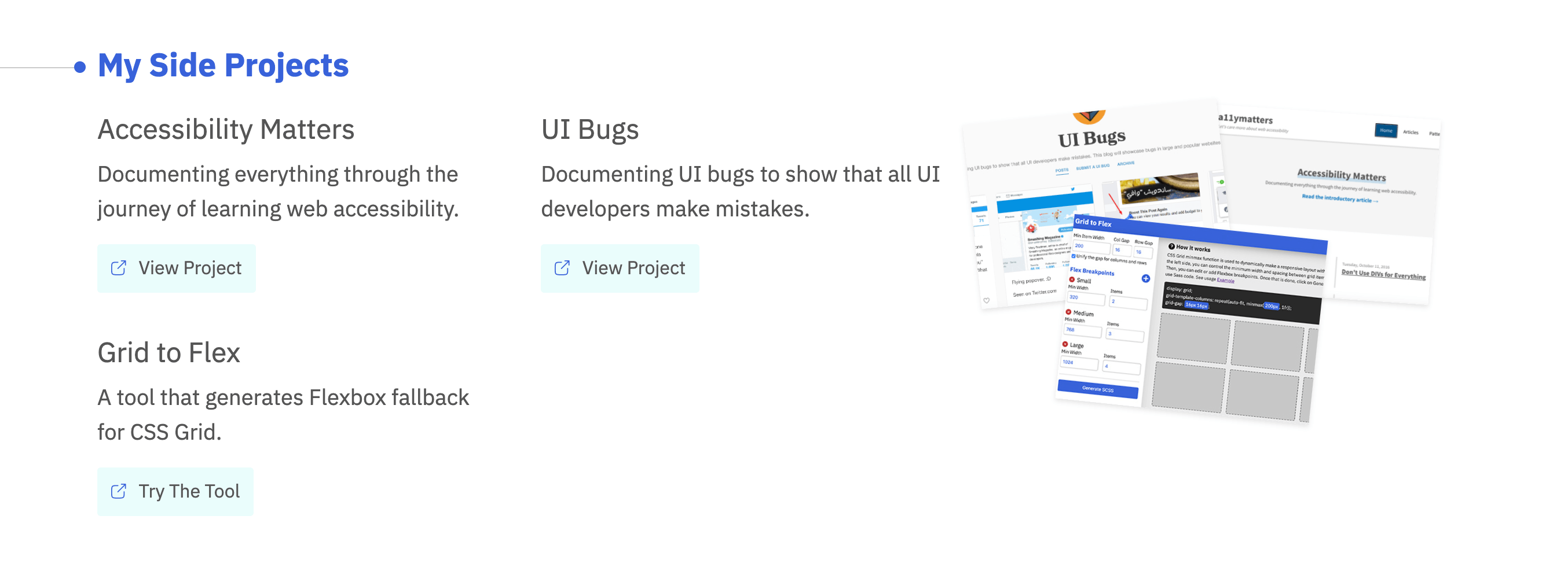 On my website, I have a section that lists all of my projects. I wanted to add a thumbnail for each project, but it wasn’t a top priority thing for me. What’s more important to me is the link itself. I first saw this effect a while ago on Ethan Marcotte website.