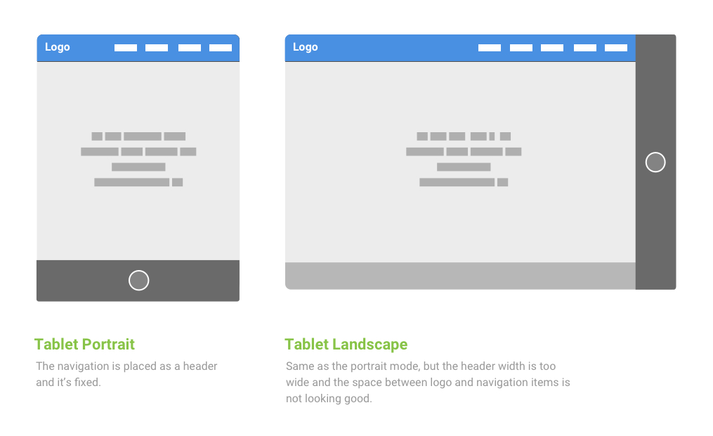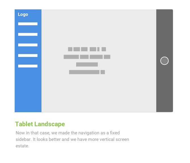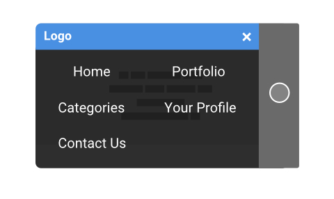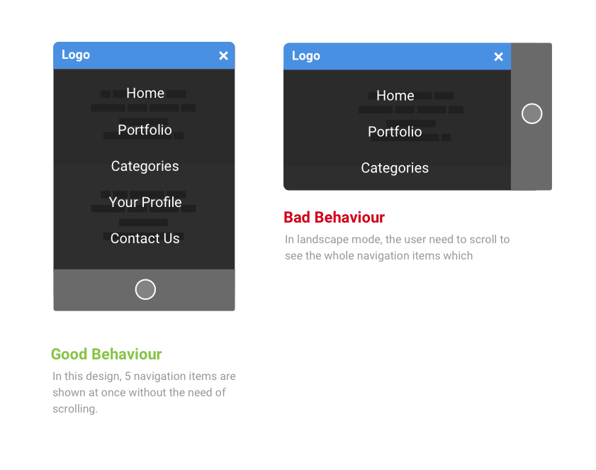 There are a lot of patterns for mobile navigation. One of them that cover the whole screen as in the below illustration. In mobile portrait mode it’s almost looking good and the user doesn’t need to scroll down a lot. But in landscape mode, the scrolling will be annoying so the solution for that is to check for height, if it’s less than 400px for example, each navigation item will occupy 50% width.