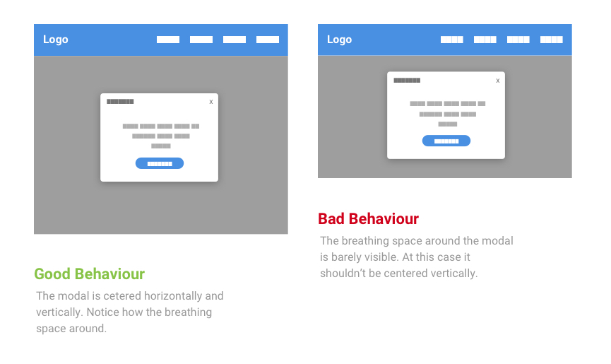Usually the modal (dialog) should be centered vertically and horizontally. The goal of this is to grab the user attention. But, in smaller viewport screens the modal top and bottom edges might be very close to the screen vertical edges. In that case, it’s better to make the modal centered horizontally only and for the vertical centering, it will stick to top (no centering).