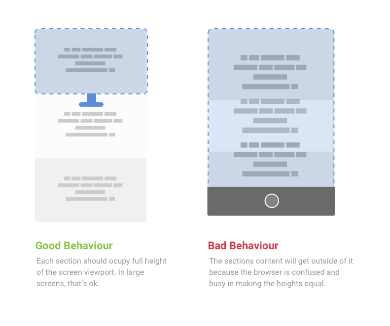 Sometimes the designer work on a web page that is divided into multiple sections, each one should occupy the full viewport height. In CSS, the easiest way to do it is by using viewport unites vh, vw, vmin, vmax. If each section has a content that almost fill it, in smaller viewport height this will cause an overlapping issue so we will notice that each section content appear above the other.